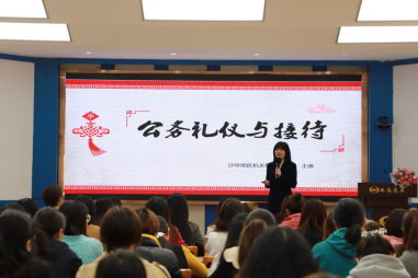 王源用温柔的话语告诉我们公务礼仪与接待的基本要求是“自律、真诚、敬人、适度”。她从公务接待人员的仪容仪表、行为举止、会议筹备及服务工作等多个方面讲授了公务接待中的基本准则和注意事项。随后向大家展示了几种基本的站姿与坐姿,这些平常容易被我们忽视的细微处,里面却大有讲究,还专门就如何在会议中为领导续茶添水进行了现场演示。王源的讲解深入浅出、通俗易懂,加上形象生动的示范指导,使参会人员受益匪浅。