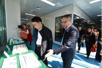 赖明才一行首先参观了公司粉针剂车间,在车间门口展板前,鲜亚向赖明才一行介绍了公司概况、发展历程、战略愿景并对公司抗疫药品保供情况作简要汇报。赖明才十分关心复方对乙酰氨基酚片(Ⅱ)(商品名:散列通)、布洛芬缓释片(商品名:芬尼康)等抗疫药品的生产情况,高度赞扬了公司在抗疫保供期间的突出贡献。