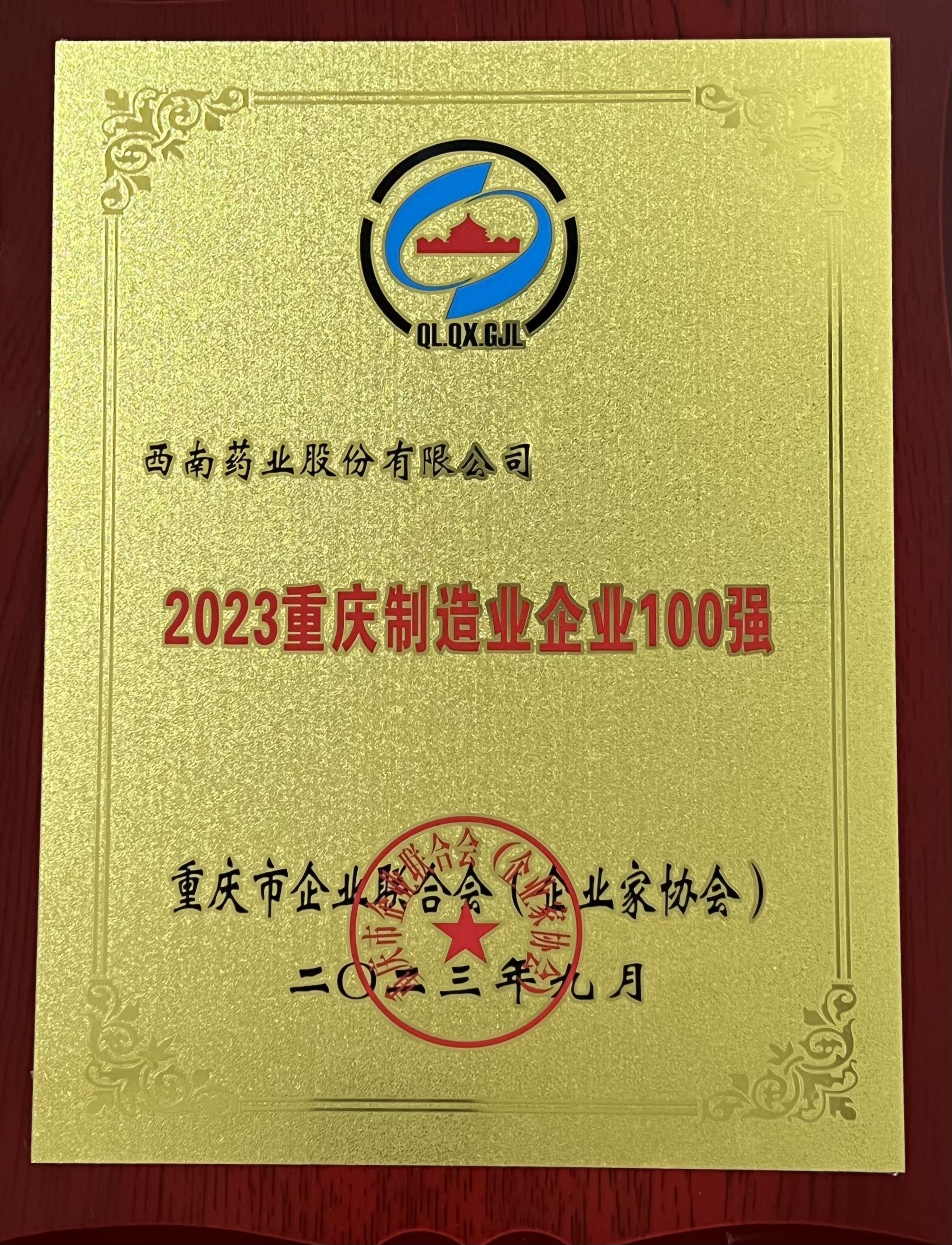 2023年9月重庆市企业联合会(企业家协会)颁发的2023重庆制业企业100强
