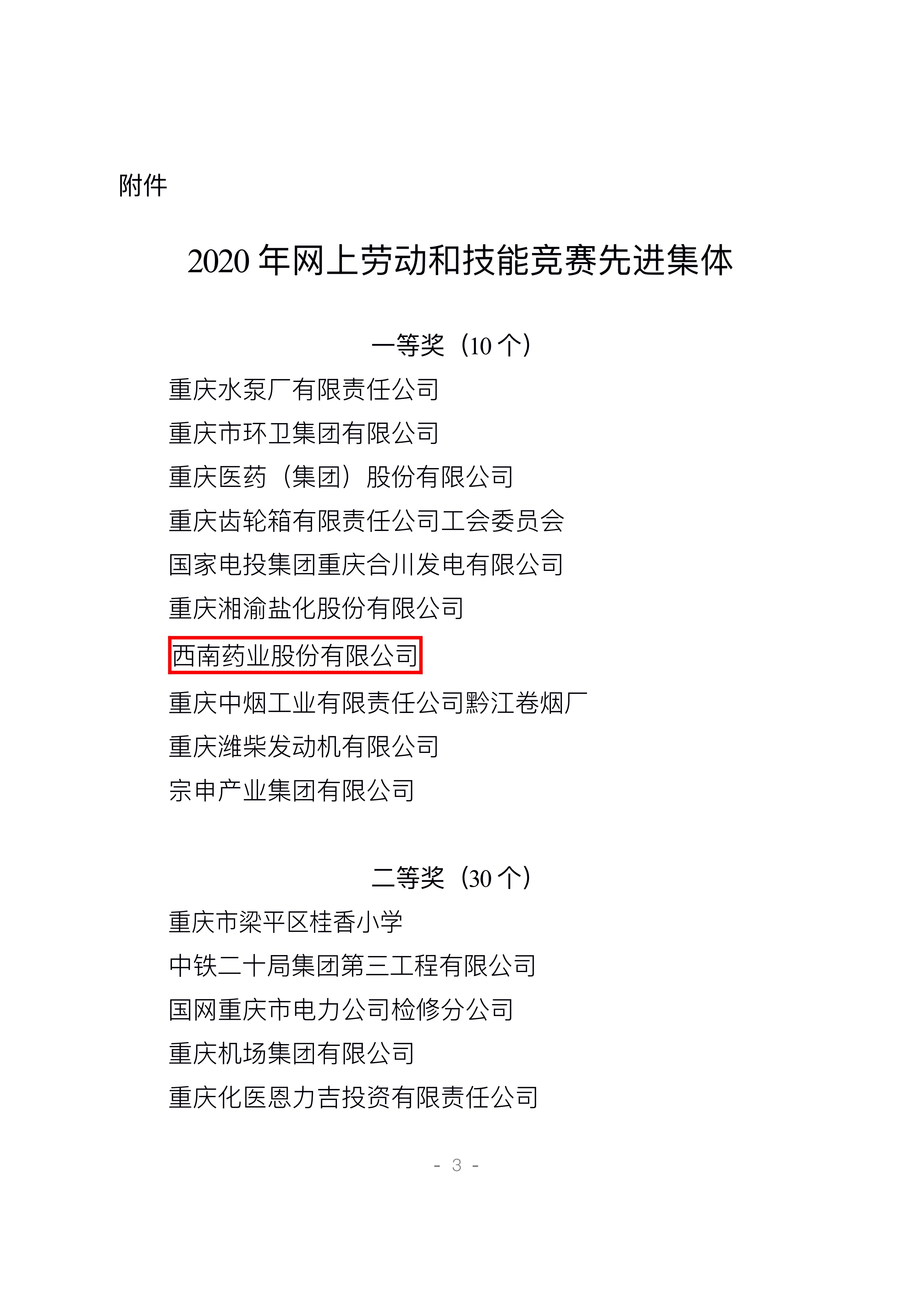 喜 报!西南药业荣获重庆市网上劳动和技能竞赛先进集体一等奖